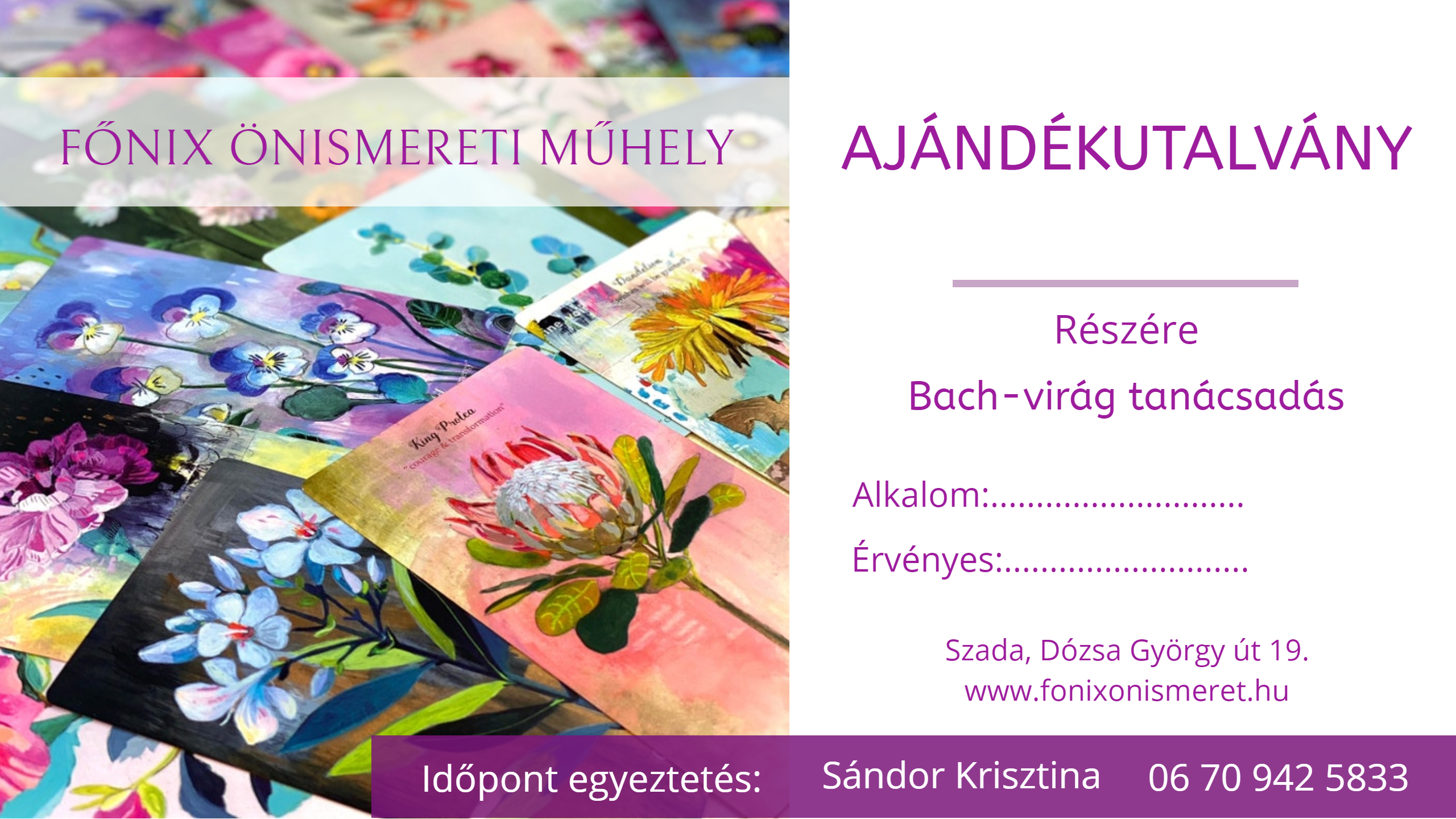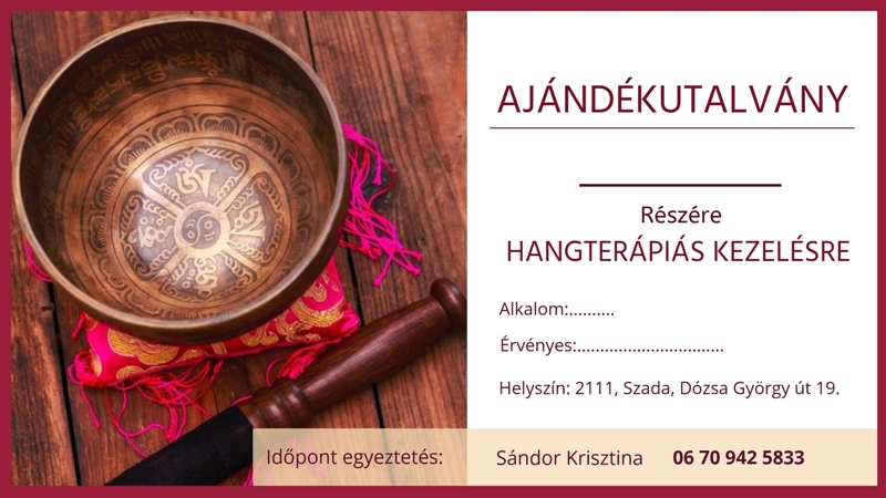 Tibeti Hangterápia 75 perc 14.000 Ft /60 perc kezelés + 15 perc visszatérés/ 60 perc 12.000 Ft /50 perc kezelés + 10 perc visszatérés/ Kedvezmény Ajándékutalvány Ajándékozd meg családod, barátaid egy különleges hangélménnyel és feltöltődéssel! 90 perc 18.000 Ft Állítóknak: 16.000 Ft Segítőknek: 8.000 Ft Egyéni Női Mentoring - Kiteljesedés a Nőiség megélésében 90 perc 18.000 Ft Női kör Szombatonként 16.000 Ft/nap Előző életes utazás 90-120 perc 25.000 Ft Bach-virág tanácsadás 60 perc 12.000 Ft /Tartalmazza az eszenciakeveréket is/ Reiki energetikai kezelés 60 perc 12.000 Ft 60 perc 12.000 Ft /Életútkísérés művészetterápiás gyakorlatokkal/ Ajándékozz Bach-virág tanácsadásra szóló alkalmat: